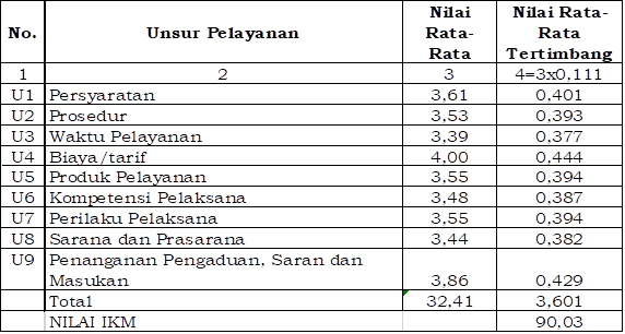 Dari tabel tersebut di atas jawaban yang diberikan oleh 182 (Seratus Delapan Puluh Dua) responden yang telah memberikan pendapatnya terhadap 9 unsur yang menjadi obyek survey IKM, nilai IKM Unit Badan Kepegawaian dan Pengembangan Sumber Daya Manusia Kota Tasikmalaya diperoleh angka 90,03 atau nilai persepsinya di atas angka 3 (tiga). Hal ini berarti pelayanan yang diberikan aparatur Badan Kepegawaian dan Pengembangan Sumber Daya ManusiaKota Tasikmalaya secara umum termasuk dalam kategori Mutu Pelayanan ’A’ dan Kinerja Unit Pelayanan ’Sangat Baik’.